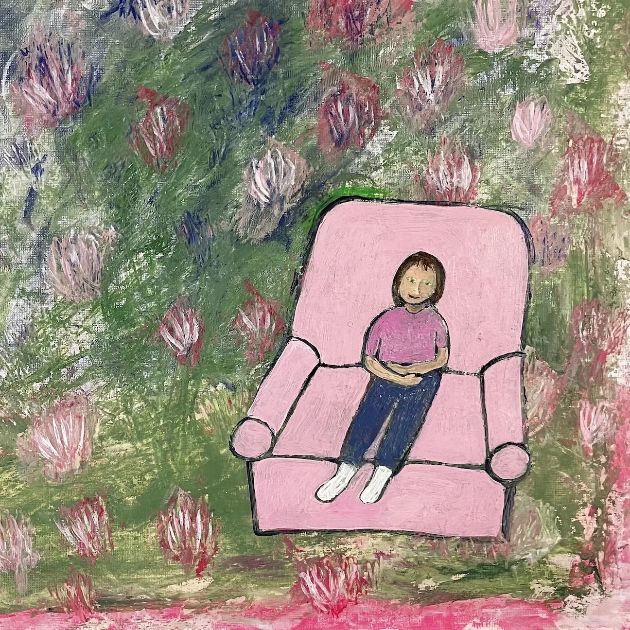 Young Girl in a Pink Chair in a Clover Garden